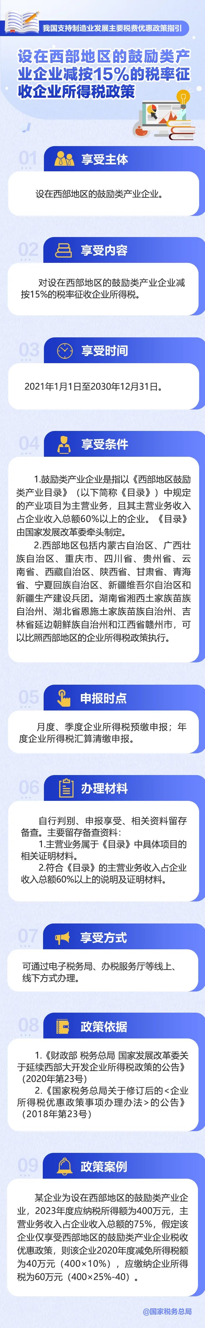 制造業(yè)是立國之本、強(qiáng)國之基,是實(shí)體經(jīng)濟(jì)的重要組成部分。中央經(jīng)濟(jì)工作會(huì)議指出,“落實(shí)好結(jié)構(gòu)性減稅降費(fèi)政策,重點(diǎn)支持科技創(chuàng)新和制造業(yè)發(fā)展”。為使大家更加全面熟悉了解政策、更加高效準(zhǔn)確適用政策,財(cái)政部、國家稅務(wù)總局近日發(fā)布《我國支持制造業(yè)發(fā)展主要稅費(fèi)優(yōu)惠政策指引》。今天帶你了解:設(shè)在西部地區(qū)的鼓勵(lì)類產(chǎn)業(yè)企業(yè)減按15%的稅率征收企業(yè)所得稅政策↓