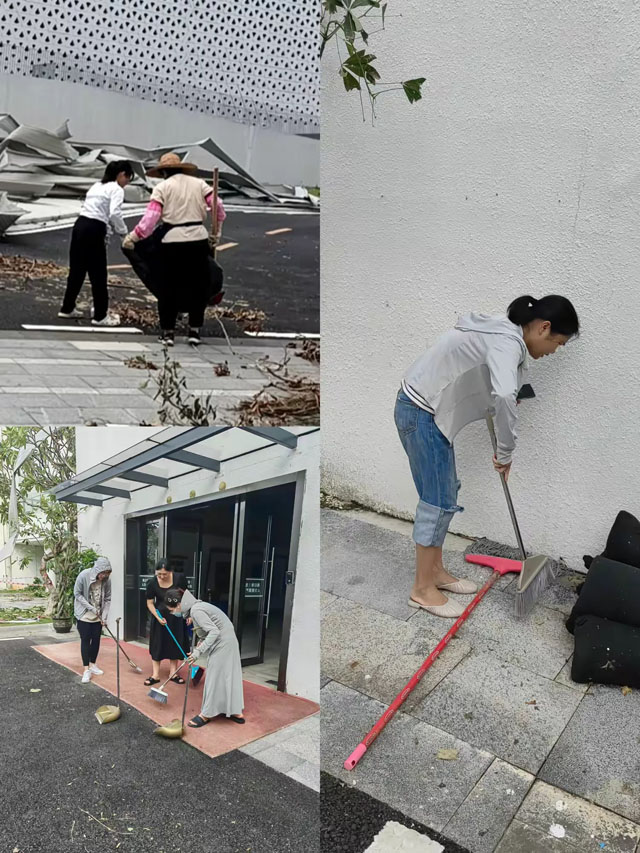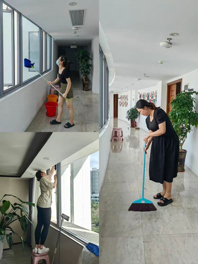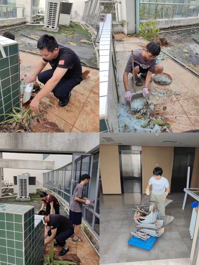 為恢復(fù)園區(qū)舒適的辦公環(huán)境,大家一起對辦公樓內(nèi)進(jìn)行全面大掃除,清掃災(zāi)后留下的灰塵碎片,清理窗戶上的樹葉棉絮,還進(jìn)行了全面的病蟲害消殺工作。