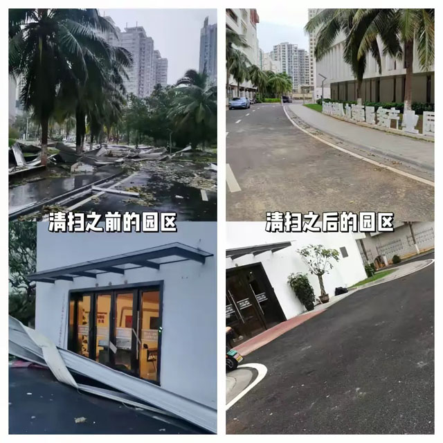 今年第11號超強臺風(fēng)“摩羯”對海口市造成了嚴(yán)重影響,為盡快恢復(fù)園區(qū)正常運營,保障園區(qū)各企業(yè)災(zāi)后復(fù)工復(fù)產(chǎn),園區(qū)總經(jīng)理劉昕暉對此高度重視,迅速組織園區(qū)工作人員有序開展臺風(fēng)過后清理恢復(fù)工作,消除安全隱患。